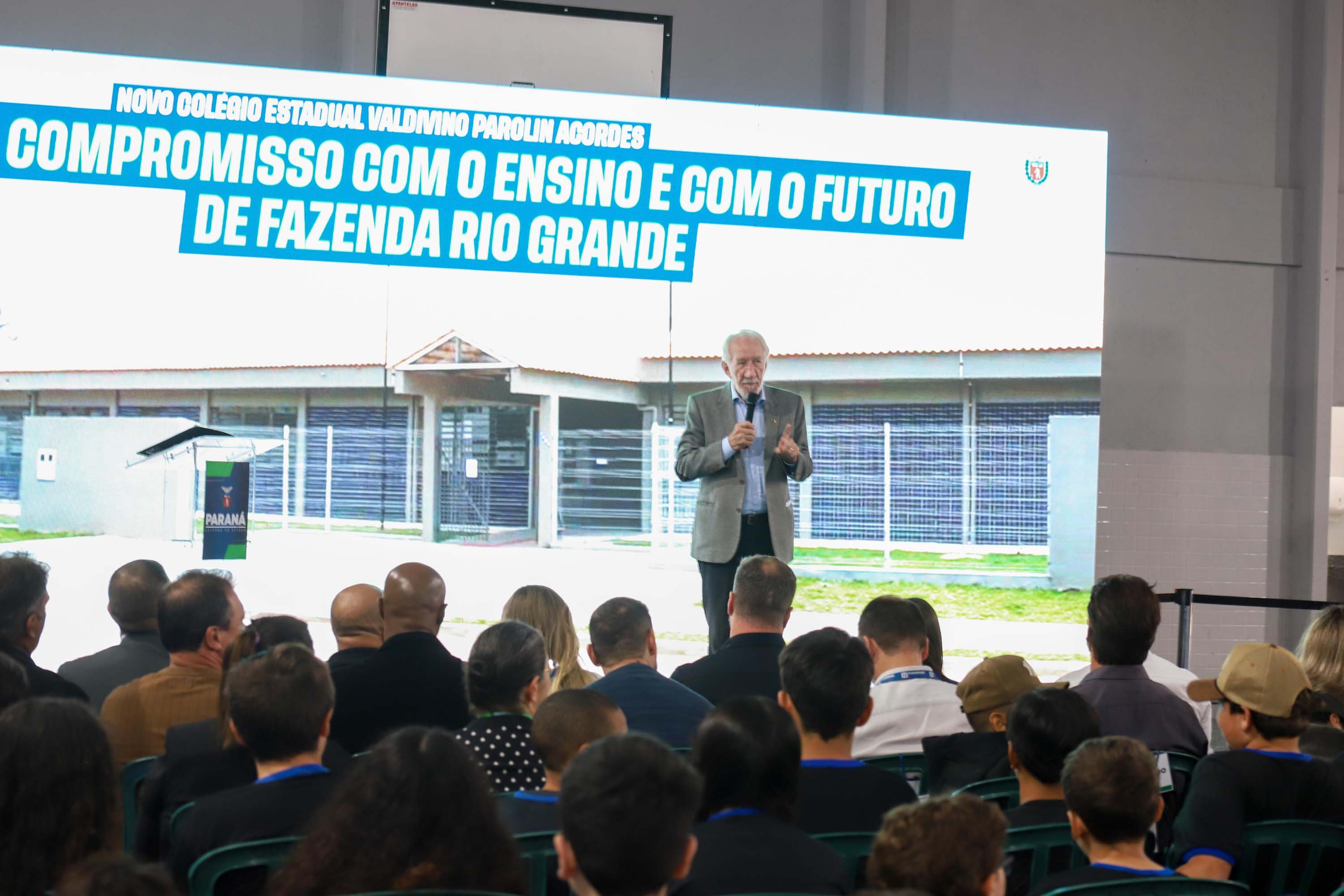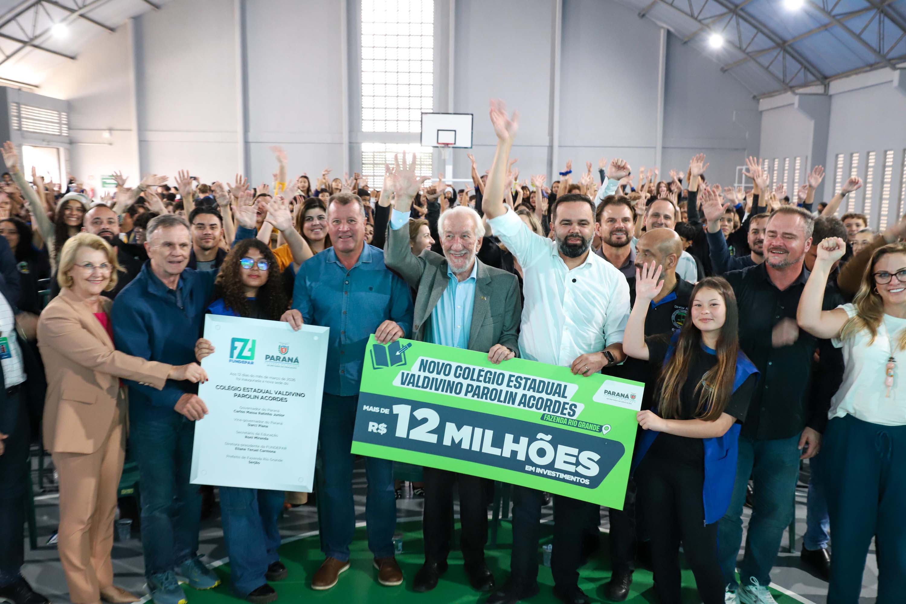 A Unidade Nova Escolar do Colégio Estadual Valdivino Parolin Acordes, localizada no bairro Estados, em Fazenda Rio Grande, Região Metropolitana de Curitiba, foi inaugurada nesta quinta-feira (12). Com investimento de R$ 12,8 milhões a comunidade recebeu uma escola que comporta 25 salas de aula, quadra poliesportiva coberta, cozinha e refeitório, pátio de convivência, biblioteca, laboratórios e espaços administrativos em mais de 4,1 mil m² de área construída.